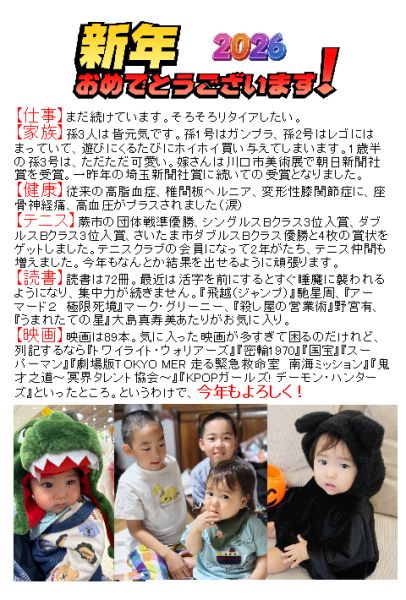 2026年01月17日(土) ▼武蔵嵐山女性会館テニスコートにて、久しぶりに8時間テニスに参加。すっかり体力は落ちているし、膝も無理がきかないし、8時間ももつかなと思っていたのだけれど、けっこう最後までゲームができていた。今日はなぜかめちゃくちゃサーブの調子がよくて、ファーストサーブの確率も高ければ、エースも量産することができた。 ここのテニスコートは3月で閉鎖になってしまうのだけれど、2月も3月も参加できそうにないので、今日が最後なのかなあ。 2026年01月16日(金) ▼問い合わせの返事はこないし、別件のデータもこないので、とりあえず朝いちでテニスクラブに行き、ダブルスを2セット。上級者相手にいい感じで勝てたので今日は満足。 そうこうするうちに、データが来たので帰宅してお仕事。 娘が孫3号をつれてやってきたのだけれど、すぐに嫁さんと一緒に買い物に出て行ったので、仕事を続ける。 問い合わせの返事が来たのは夕方で、それから集計表を仕上げて納品したところ、1箇所ミスがあってやりなおし。孫3号と遊ばせてくれ! 修正して再納品して、食事をさっさとすませて孫3号を風呂に入れて、寝かしつけ。ところが、今日は午後のお昼寝をたっぷりとしすぎたせいか、なかなか寝てくれず、ギャンギャン泣きわめく。泣きつかれたら、お気に入りの毛布を掴んで、プイっとこっちからいちばん離れたところに行って寝てしまう。キサマっ! 2026年01月15日(木) ▼終日仕事。 今日納品なのに仕様書の確定が今日というめちゃくちゃな仕事があったのだけれど、確定した仕様書が来たのが夕方で、しかもその仕様書の内容がおかしいので問い合わせを出しているのにいっこうに返事がこない。納品は明日に延期になったみたいだけれど、だけど、返事が来なければ明日の納品も難しいからね。 ▼娘から孫3号が玄関で不機嫌な顔してひっくり返っている写真が送られてきた。 嫁「どうしたの?」 娘「歯医者帰り笑」 嫁「疲れたの? 放心してるの? 怒っているの?」 娘「疲れて眠い」 嫁「歯医者で暴れたの?」 娘「歯医者では暴れてないけど、頑なに口開けなかった」 2026年01月14日(水) ▼喉に絡んだ痰や喉の荒れにパイナップルジュースがいいという情報をネットで仕入れ、嫁さんにパイナップルジュースを買ってきてもらって飲む。おおっ、確かに喉のイガイガが緩和されている気がするぞ。もっとも、その効果は半日程度だったので、もっと継続的に飲まないとダメなのかな。 ▼朝いちでテニスクラブに行き、ダブルスを3セット。今日はけっこうボールを打ったときの感触がいい。こういうときは無理をしなくても、ゲームに勝てたりするのだけれど、日によって感触がよかったり悪かったりというのは、何が違うのだろう。 ▼帰宅してせっせと仕事。明日納品なのに、仕様書の最終確定が明日ってやばいだろ。 ▼夜はテニススクールのレッスン。真面目にボレーボレーをやったら、右腕がパンパンになってしまう。 ▼できればリアル書店で買いたいと思っていたのだけれど、なかなか書店に行く機会がないので、Amazonに発注してしまった本が届く。 マイクル・コナリー『迷宮(上下)』講談社文庫 マーク・グリーニー『暗殺者の奪還(上下)』ハヤカワ文庫NV C・J・ボックス『群狼』創元推理文庫 どれも、ずっと楽しんできたシリーズなので、どれから読もうか迷ってしまう。読みたい本が目の前にあってワクワクしているのって、実に幸せだ。 2026年01月13日(火) ▼いまだ鼻水が出て、喉に痰がからまり、喉がイガイガする症状が続いている。かれこれもう半月もこの状態だ。 そのうえ、今朝は座骨神経痛の症状が出て、左の臀部が痛い。たまらんなあ。 ▼予告されていた作業のデータがなかなか届かないので、昼食後に散歩に出て少し歩こうと思ったら、家を出ようというタイミングでデータが届いてしまう。 結局、今日は1歩も外に出ないまま、ひたすらデスクワークで終わってしまった。 ▼今野敏『波濤の牙』ハルキ文庫を読了。 ![]() 台風が接近する茅ヶ崎沖で海難事故が発生し、海上保安庁特殊救難隊の惣領正らは救助に向かう。だが、救助した3人の男たちは、銃をとりだすと海難救助船「すがなみ」を制圧した。男たちは海上で受け取った大量のコカインを所持していたのだった。一方、連絡を絶った「すがなみ」の異変を察知した特殊救難隊の仲間たちは、惣領らを救うために荒れ狂う海へと乗り出していく。 今野敏が海洋冒険小説を書いていたとはまったく知らなかったのだけれど、本書を見つけた瞬間「これは絶対に面白い」と確信した。それだけ自分は、今野敏という作家を信頼している。そして、その信頼はまったく裏切られることはなかった。 文庫で300ページに満たない長さの小説でありながら、台風に荒れる海の迫力、特殊救難隊のメンバーたちの心意気、海難救助の特殊スキル、特殊救難隊というきわめて特殊な職業に就く男を恋人に持った女性の苦悩など、多彩な要素